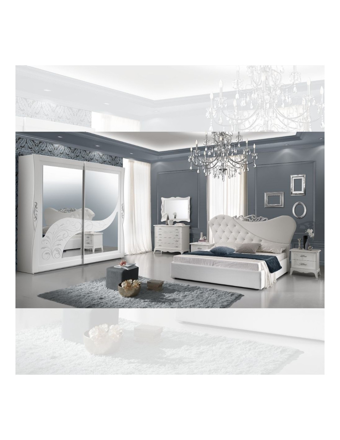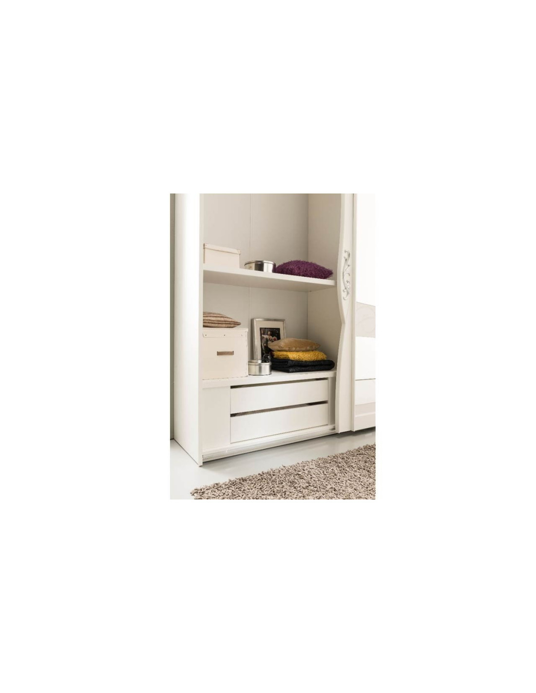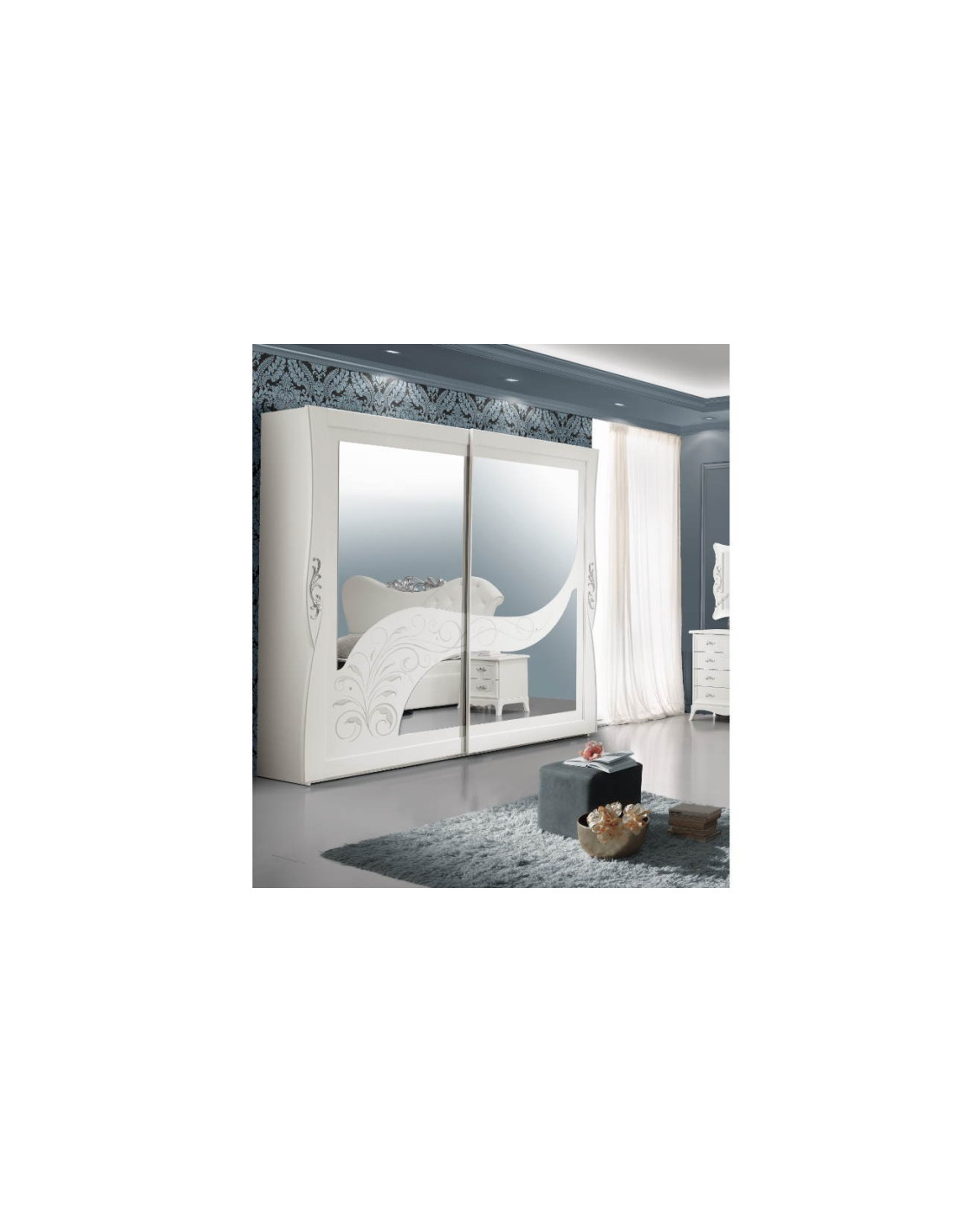 Armadio 2 ante scorrevoli con specchi. Spessore fianchi e ripiani 25 mm. Base, cappello e tramezzi spessore 18 mm. Dotato di piedini regolabili, ammortizzatori, barra di rinforzo e cassettiera interna 2 cassetti.