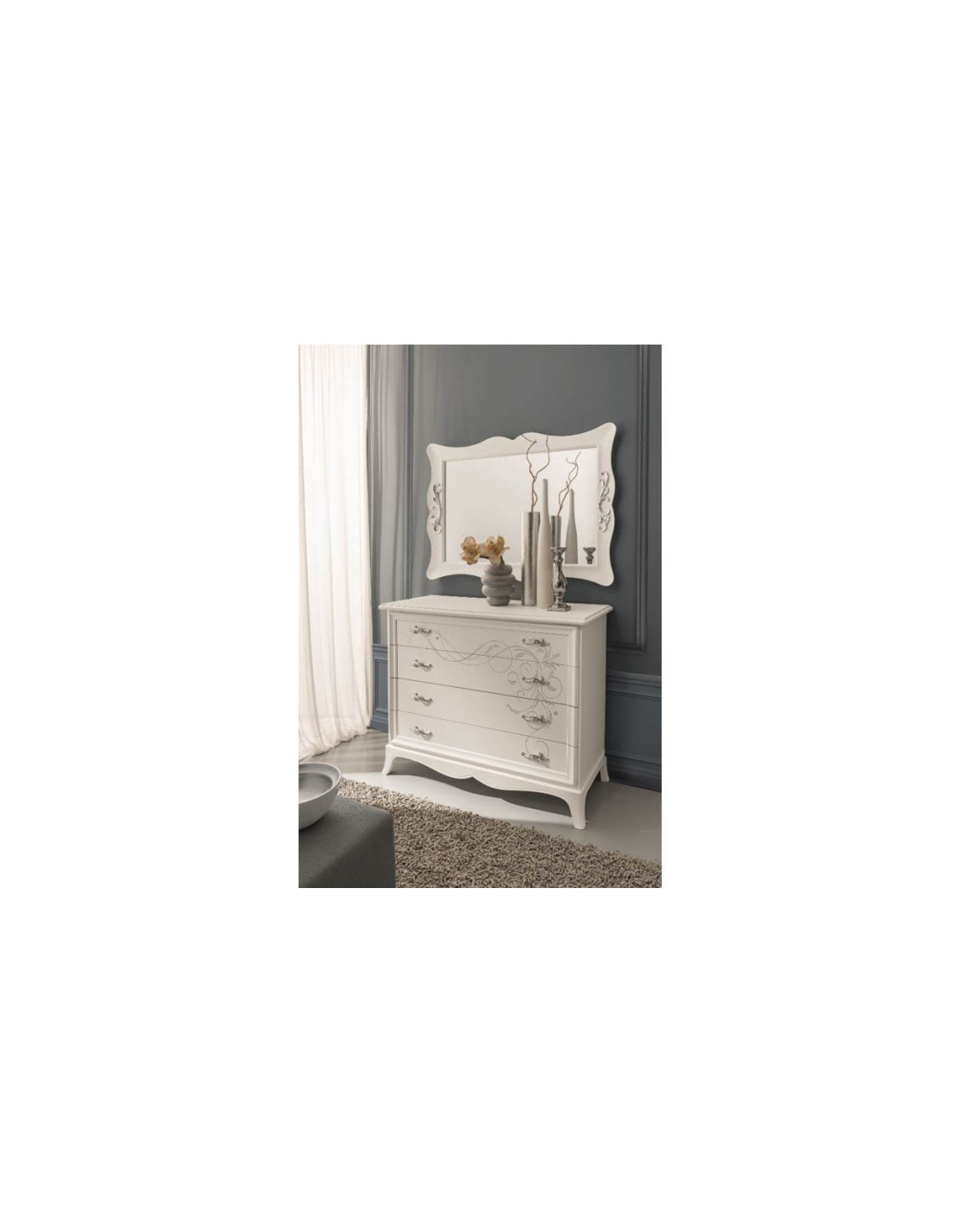Comò 4 cassetti con guide metalliche e frontali impreziositi da decoro.