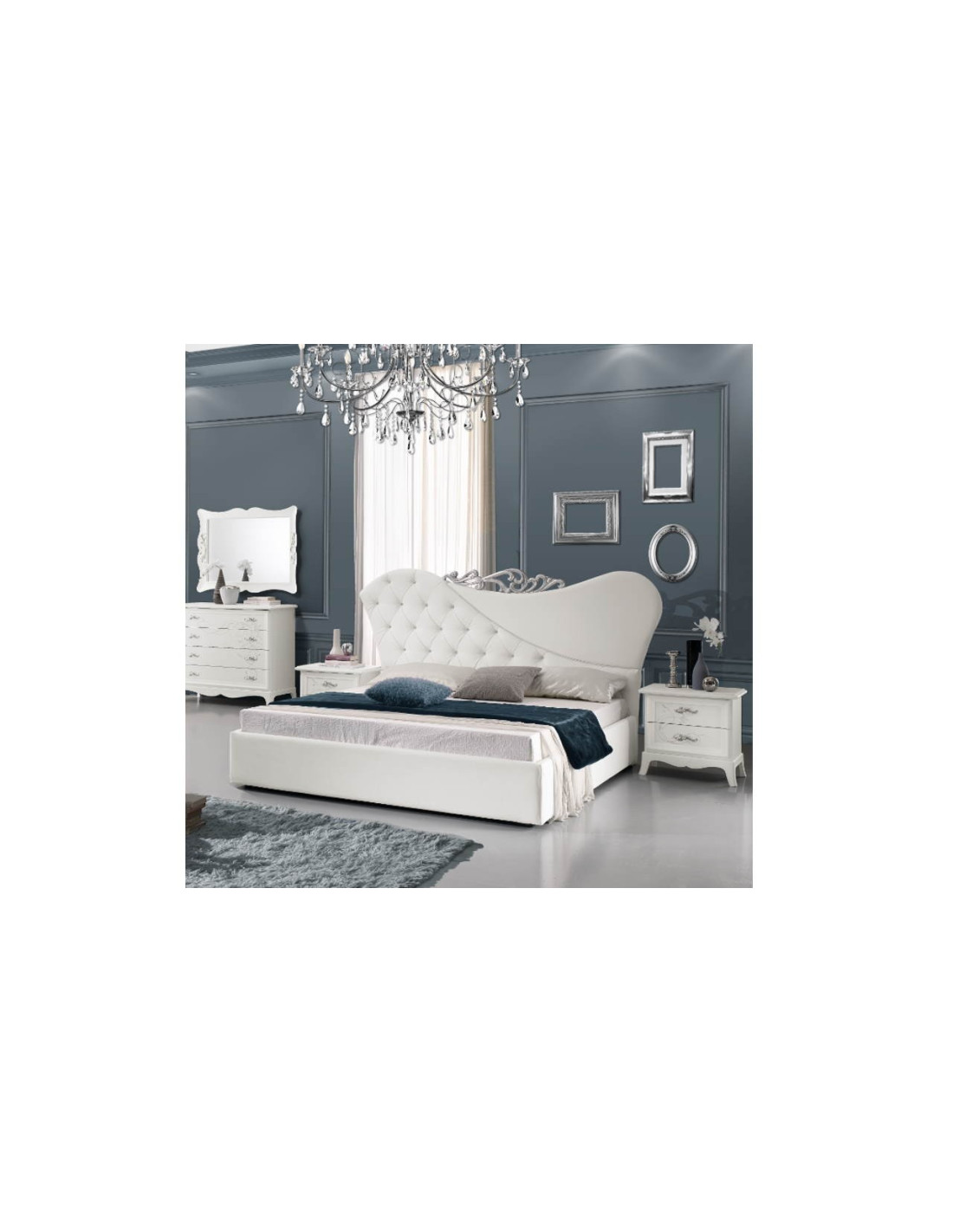 Letto matrimoniale con testata imbottita, con fregio colore argento e parziale lavorazione capitonnè. Conteniotre con rete inclusa