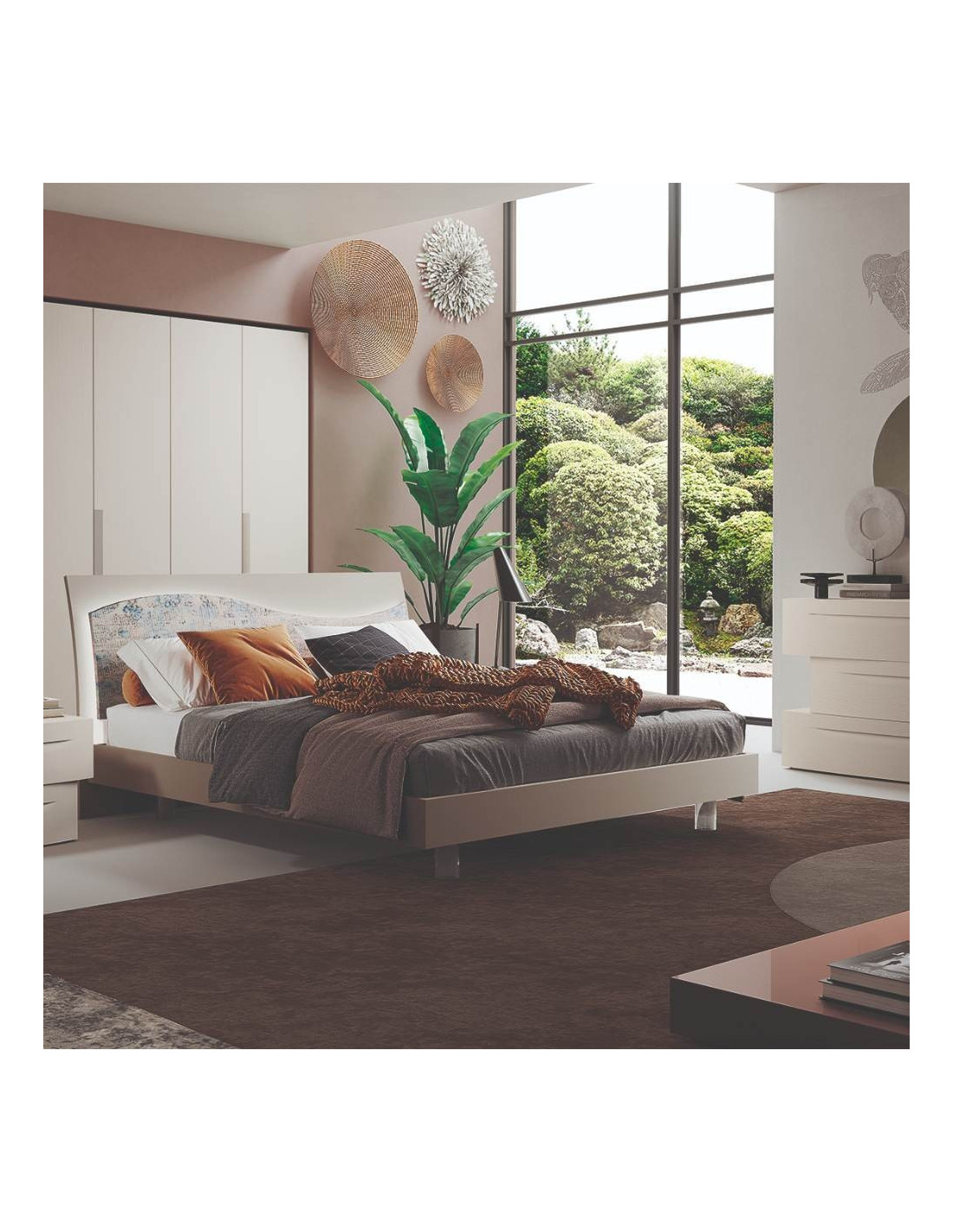 Letto matrimoniale con testiera in legno e rivestimento in tessuto denim.
