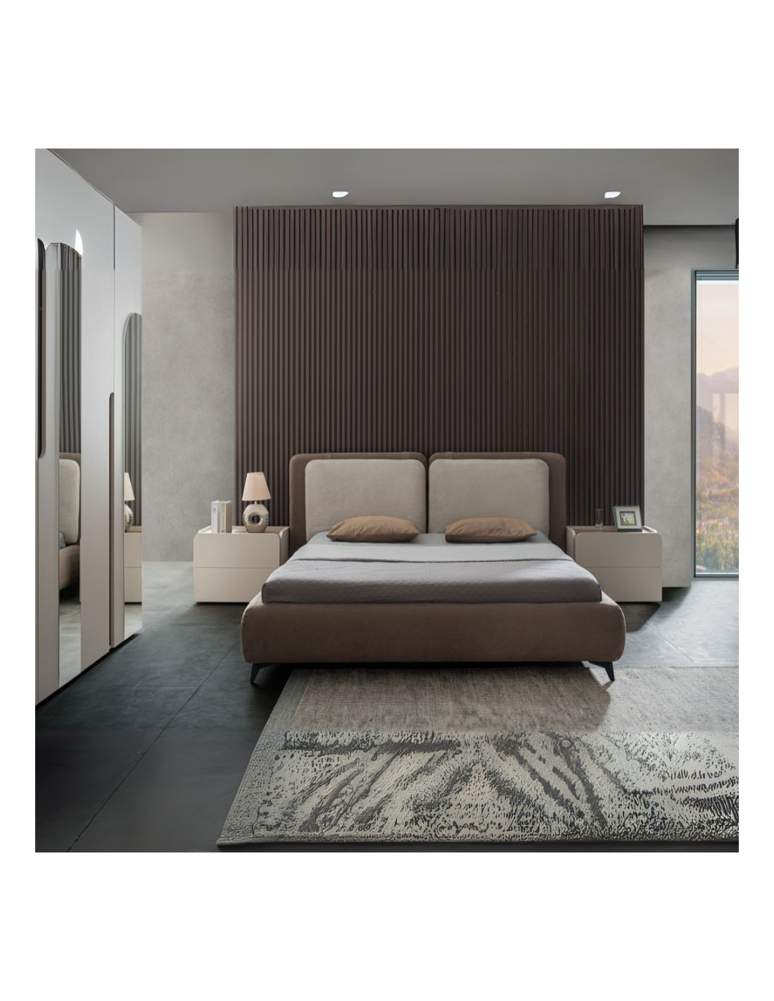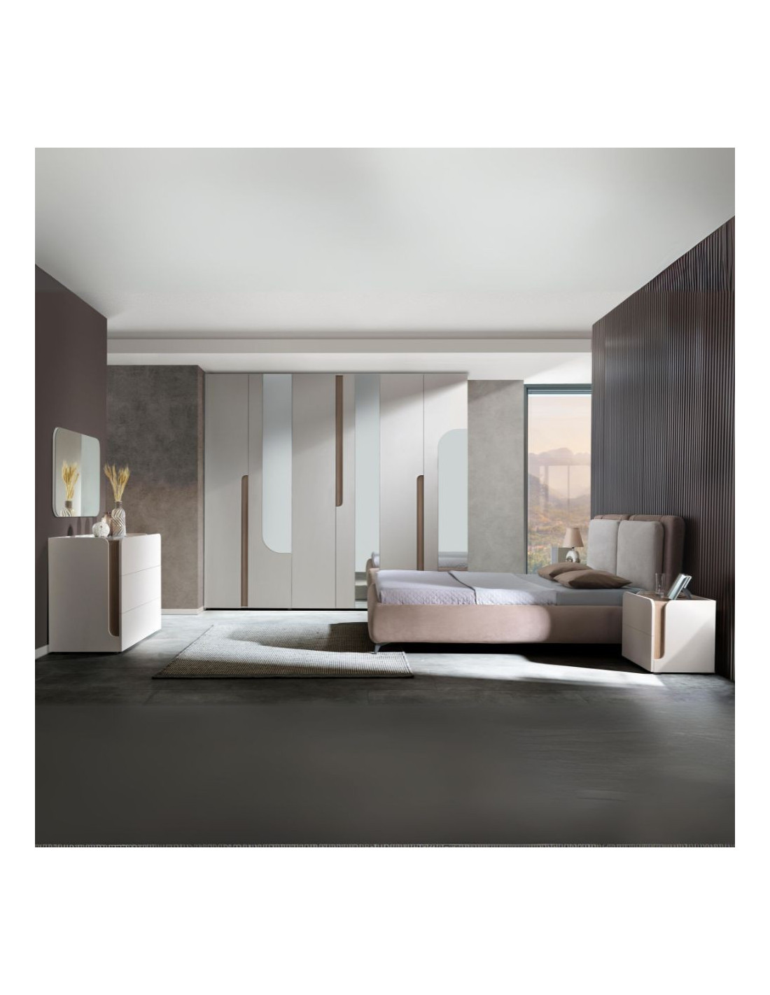 Camera da letto Loana con letto imbottito contenitore e armadio 6 ante con specchi colore cashmere biscotto