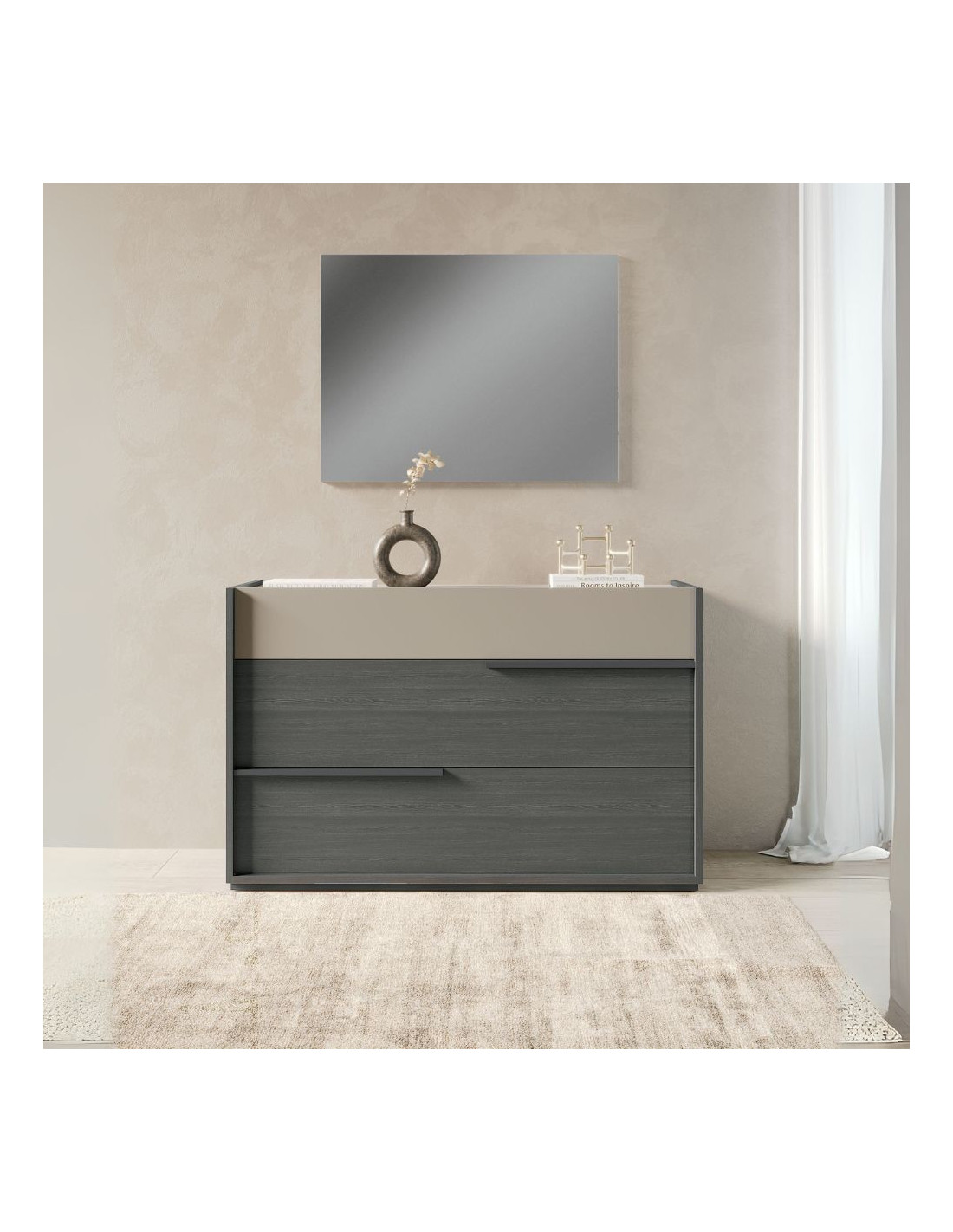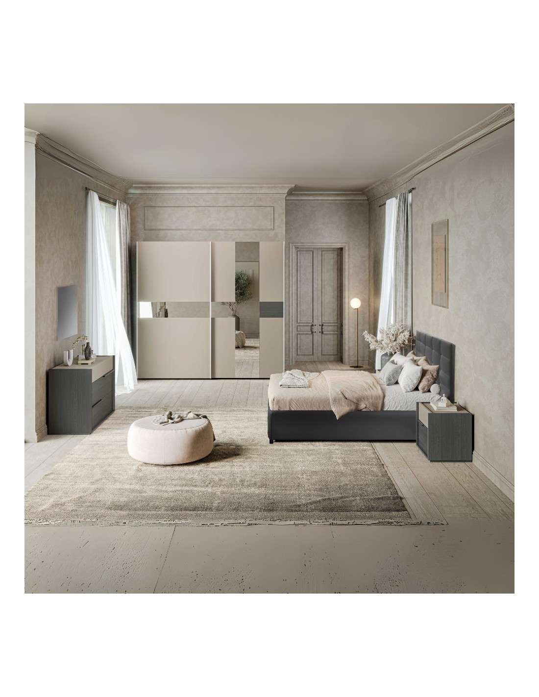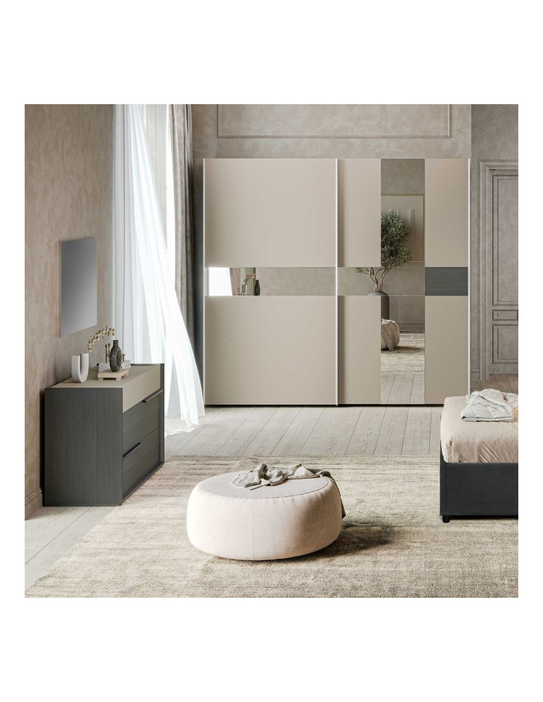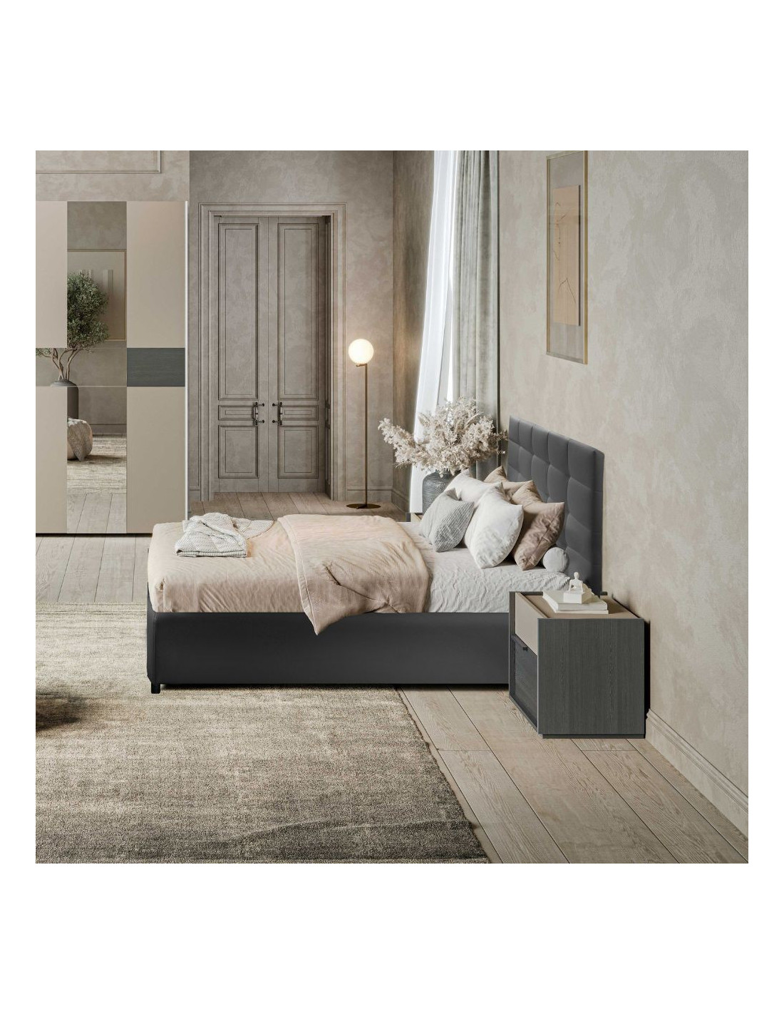 Camera da letto Tania in grigio e talco con armadio 2 ante scorrevoli con specchi e letto contenitore Napoli grigio
