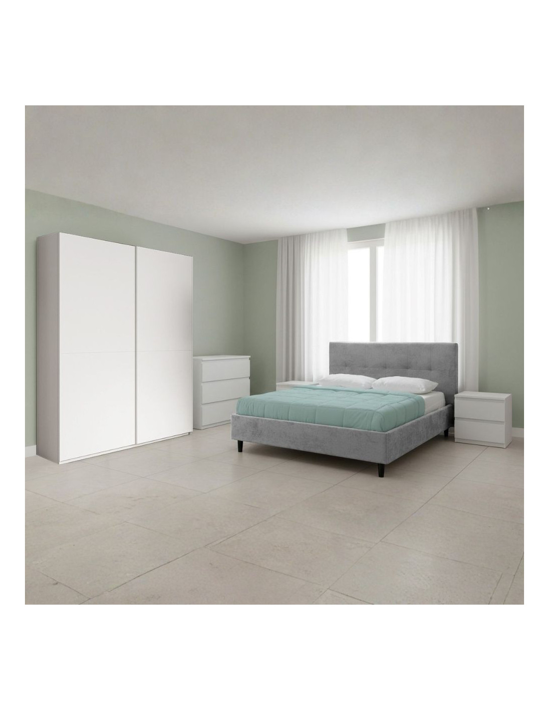 Camera da letto Rango con armadio 2 ante bianco opaco e letto Snello grigio chiaro