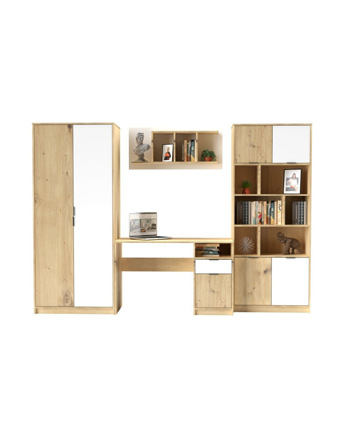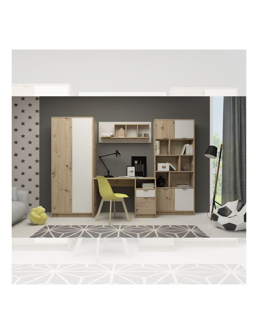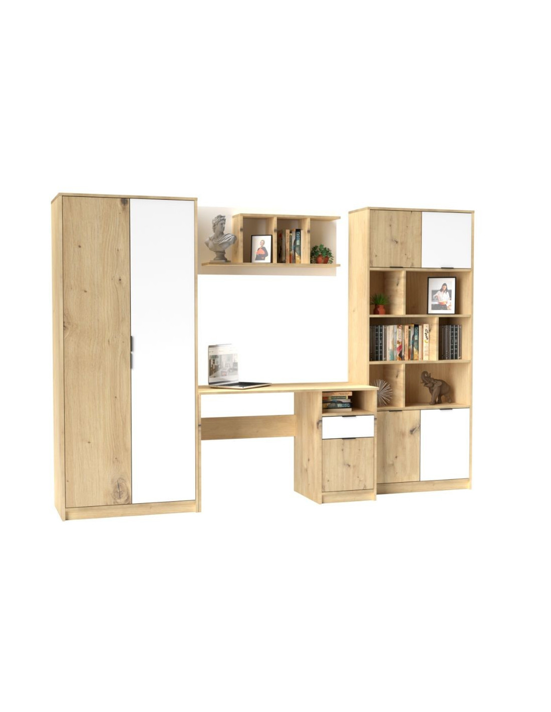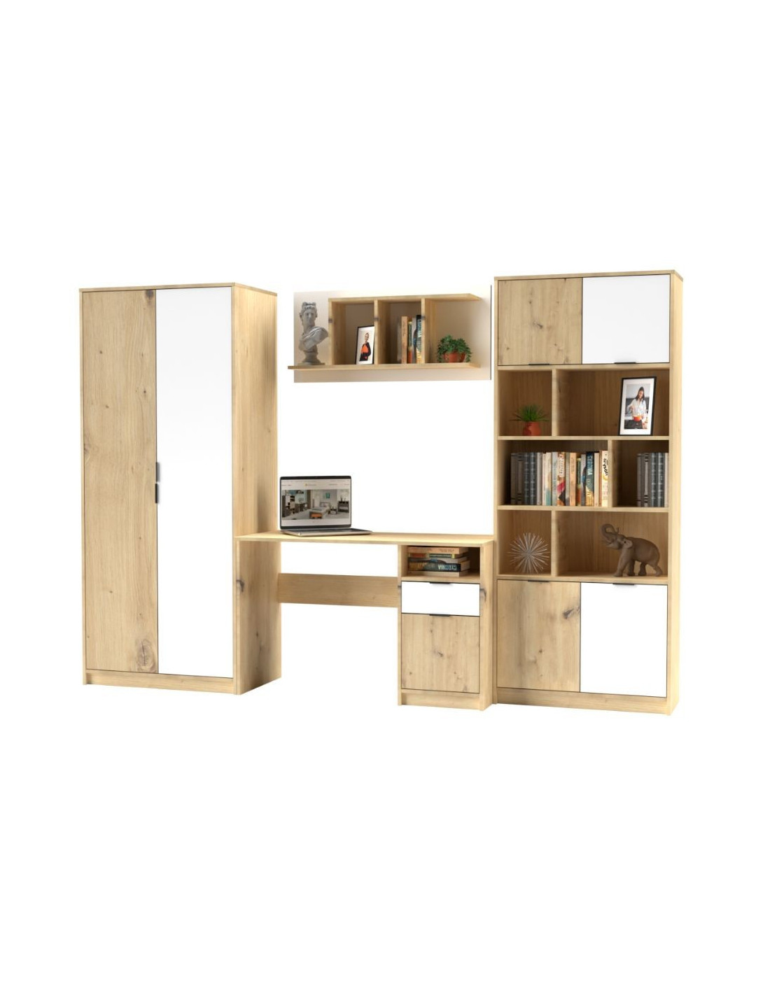 Il set contiene un armadio a due ante, scrivania, una mensola da muro e una libreria, indipendenti.