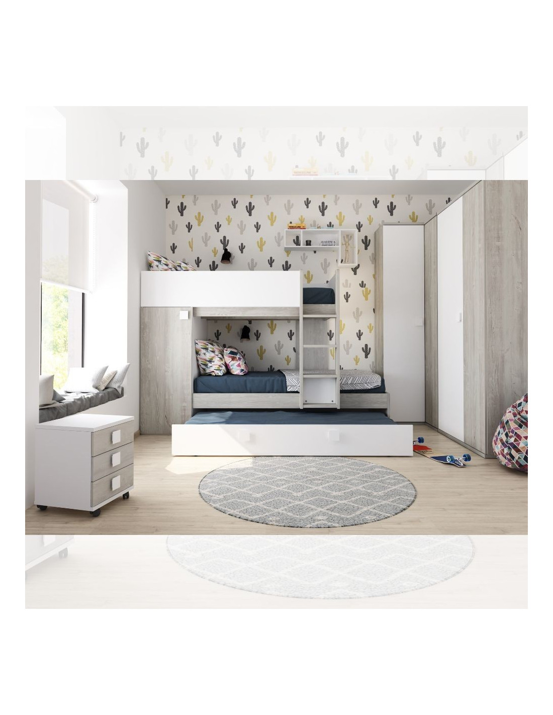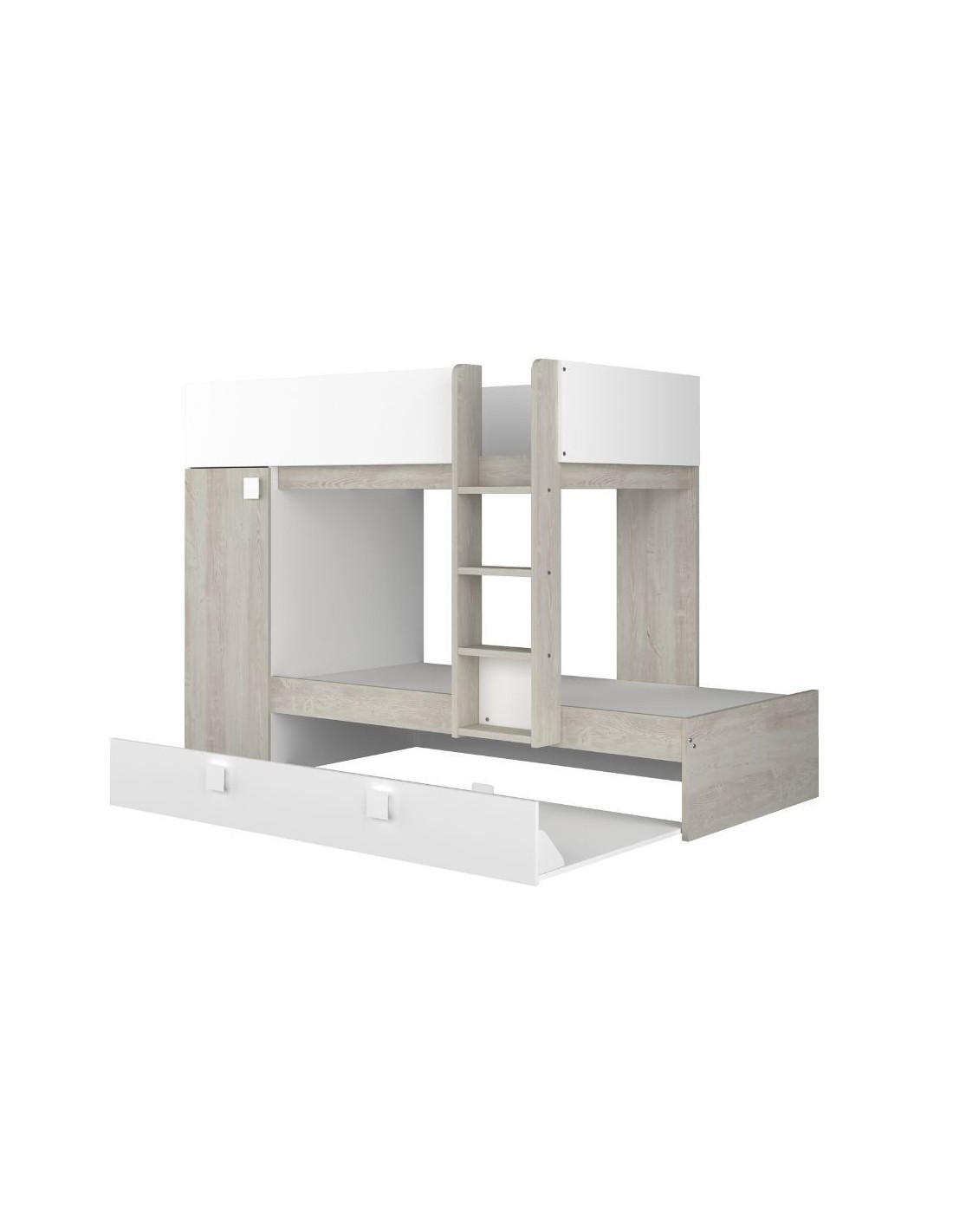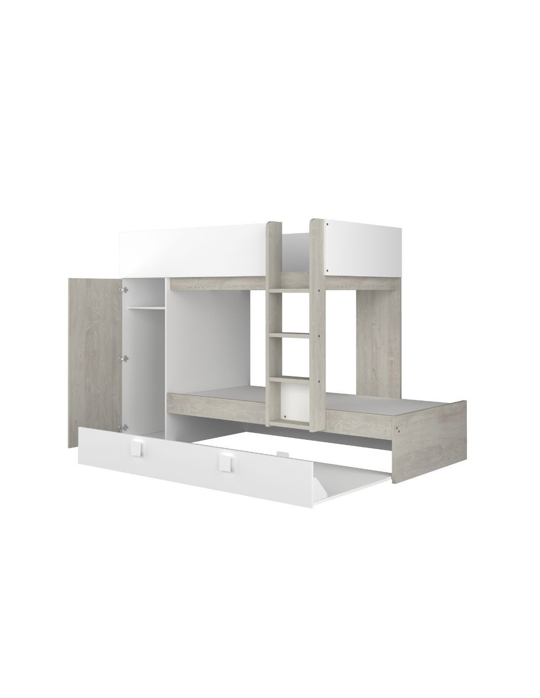 Cameretta con letto a castello e letto estraibile con armadio integrato colore bianco consumato e bianco reversibile