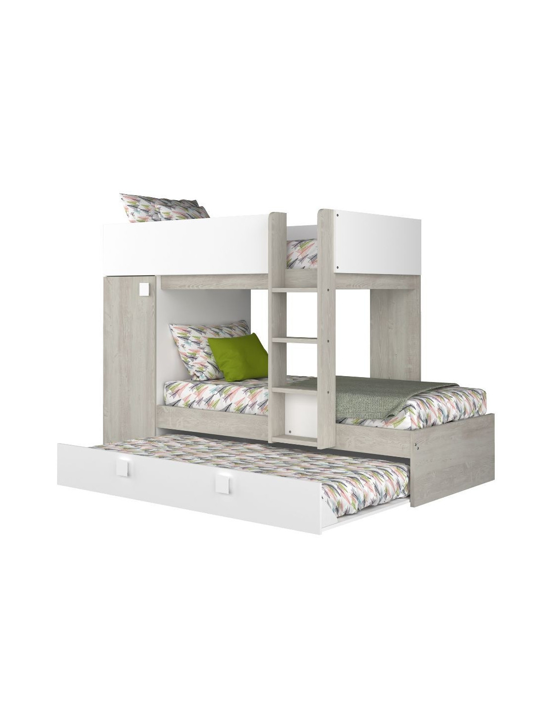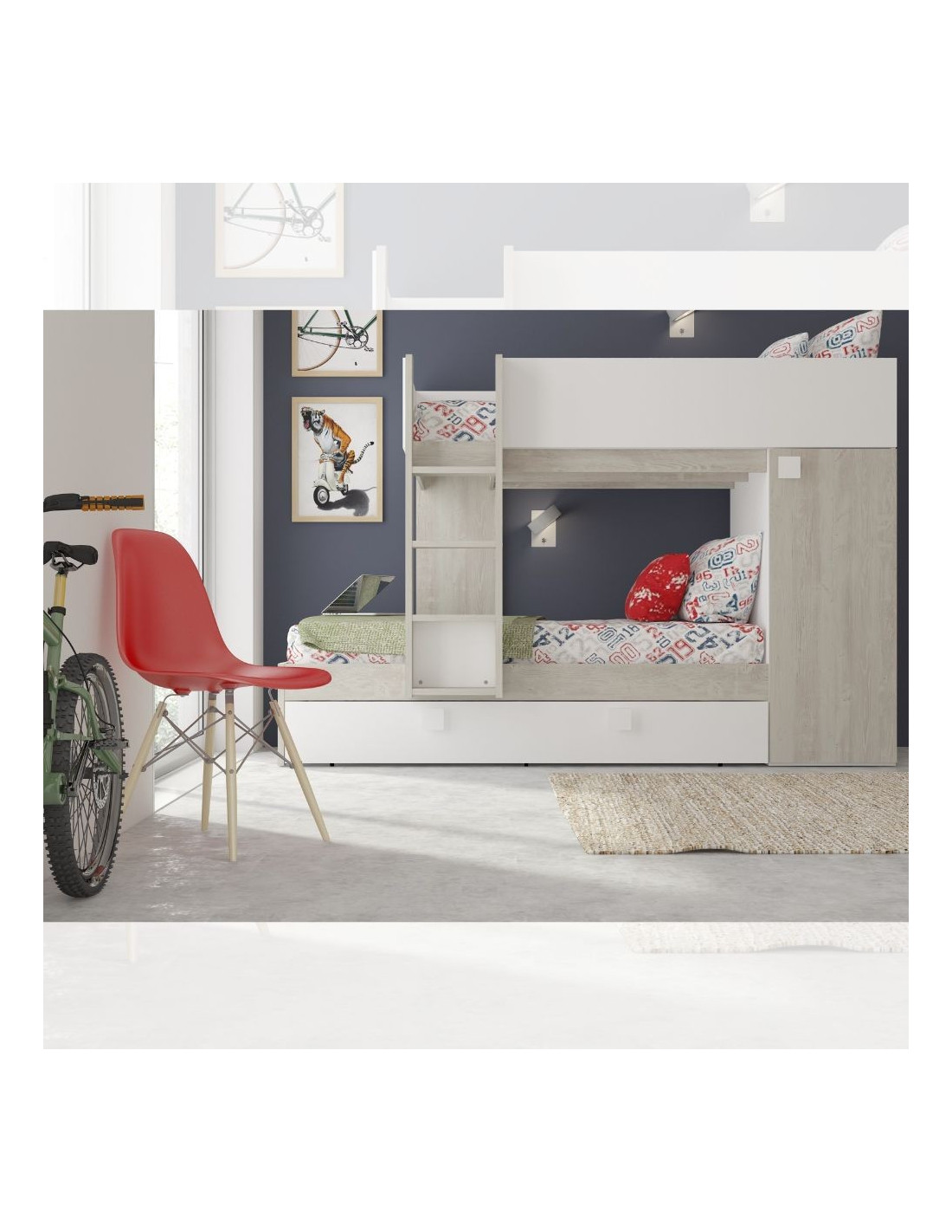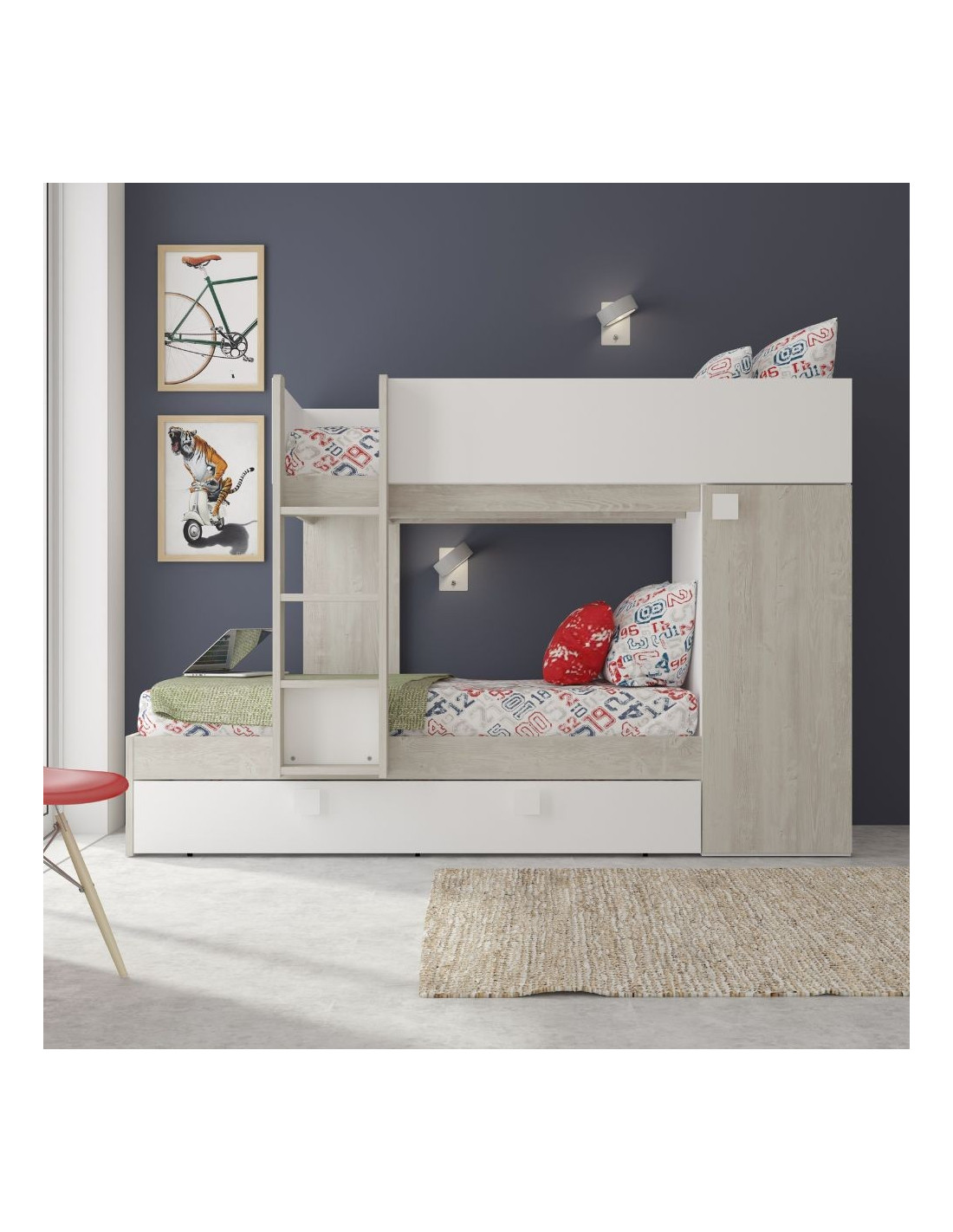 Cameretta con letto a castello e letto estraibile con armadio integrato colore bianco consumato e bianco reversibile