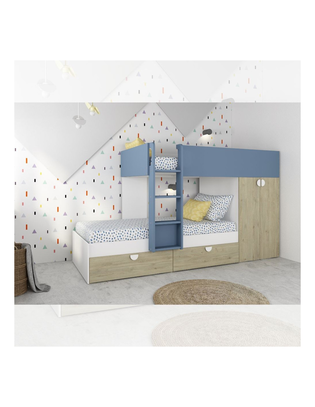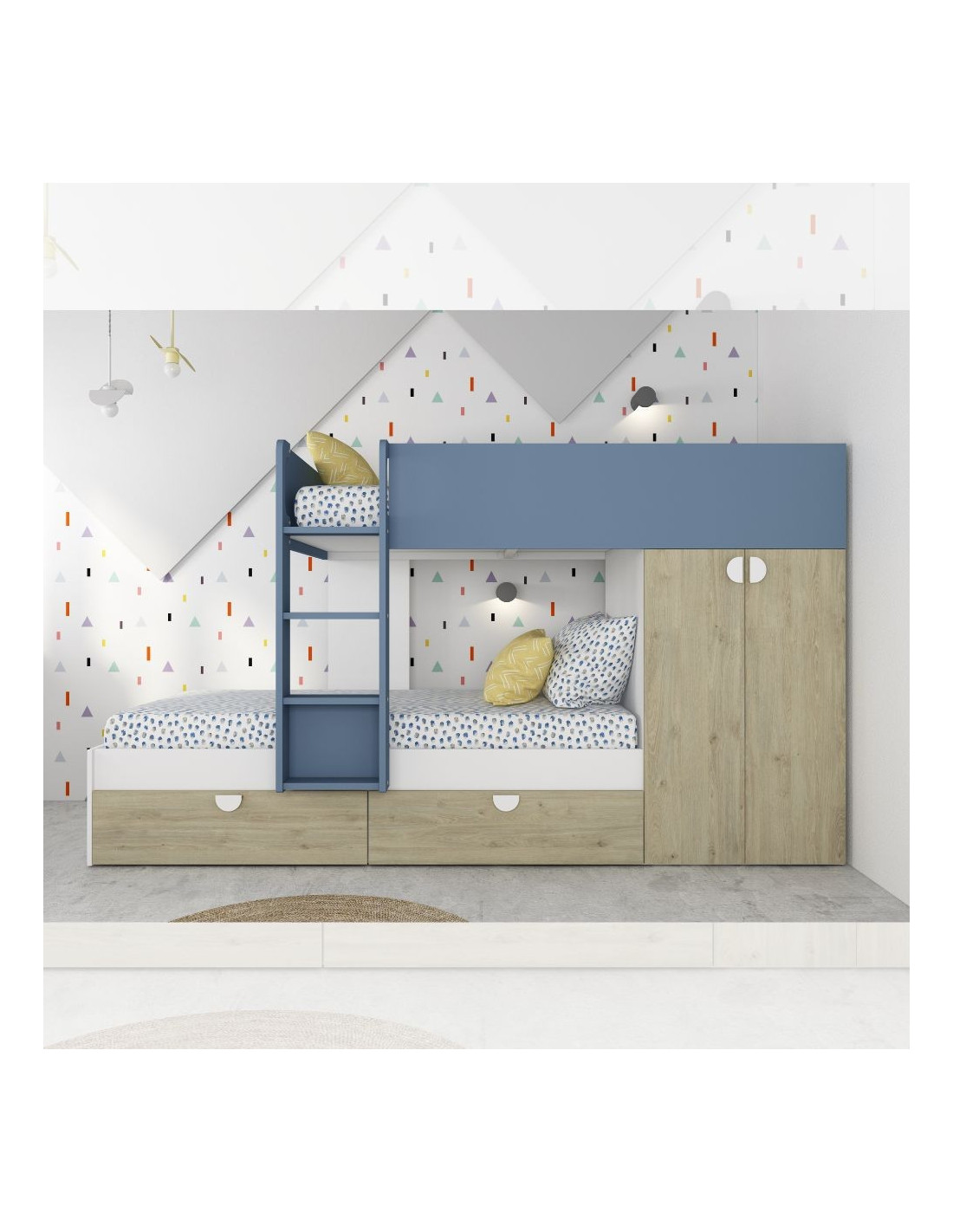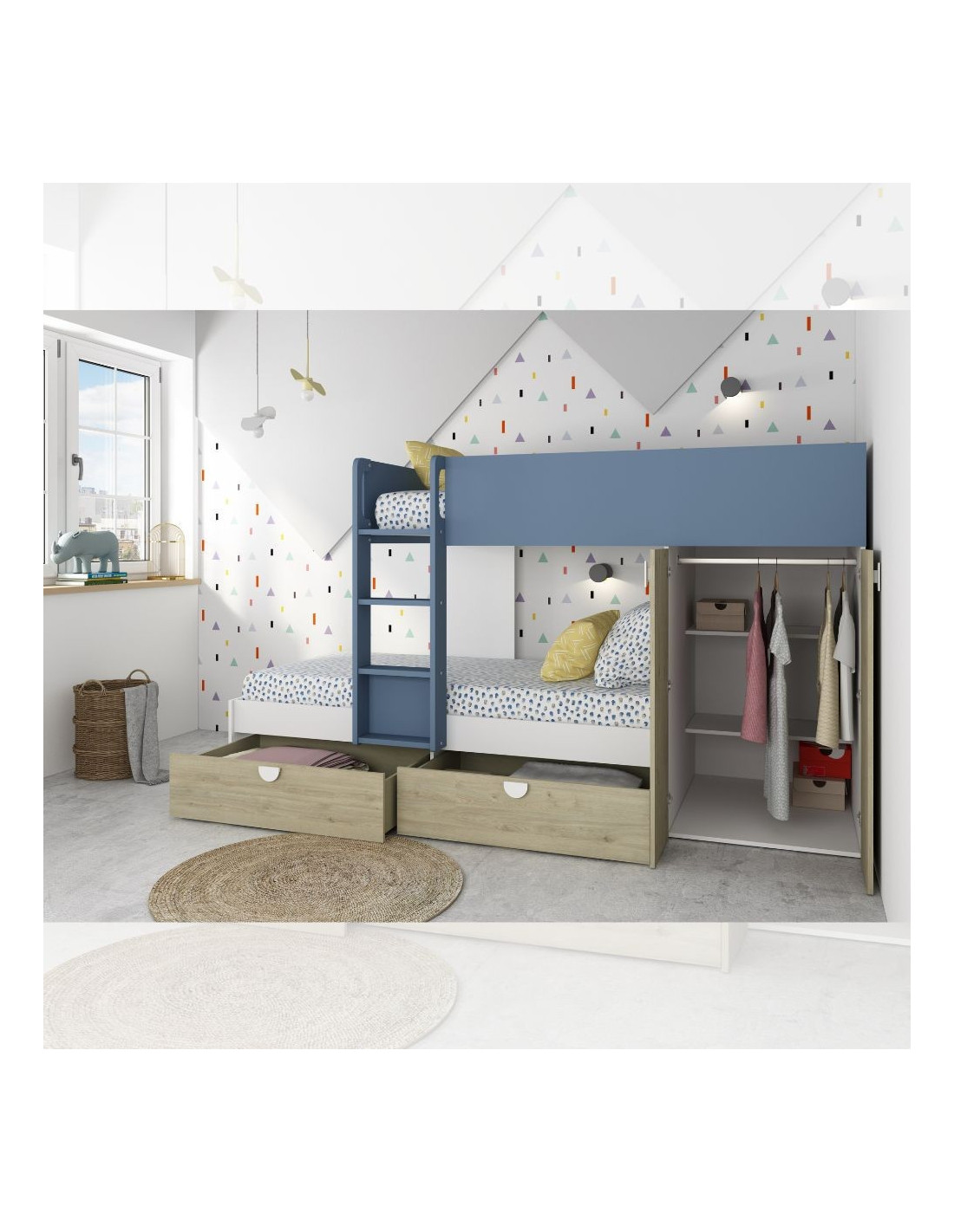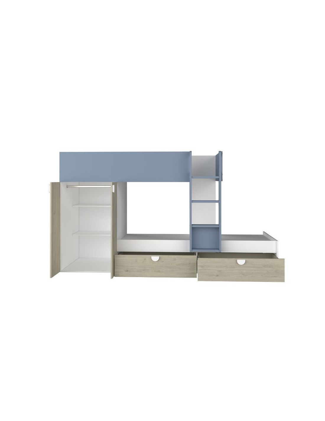 Cameretta con letto a castello con cassettoni e armadio reversibile colore rovere e azzurro