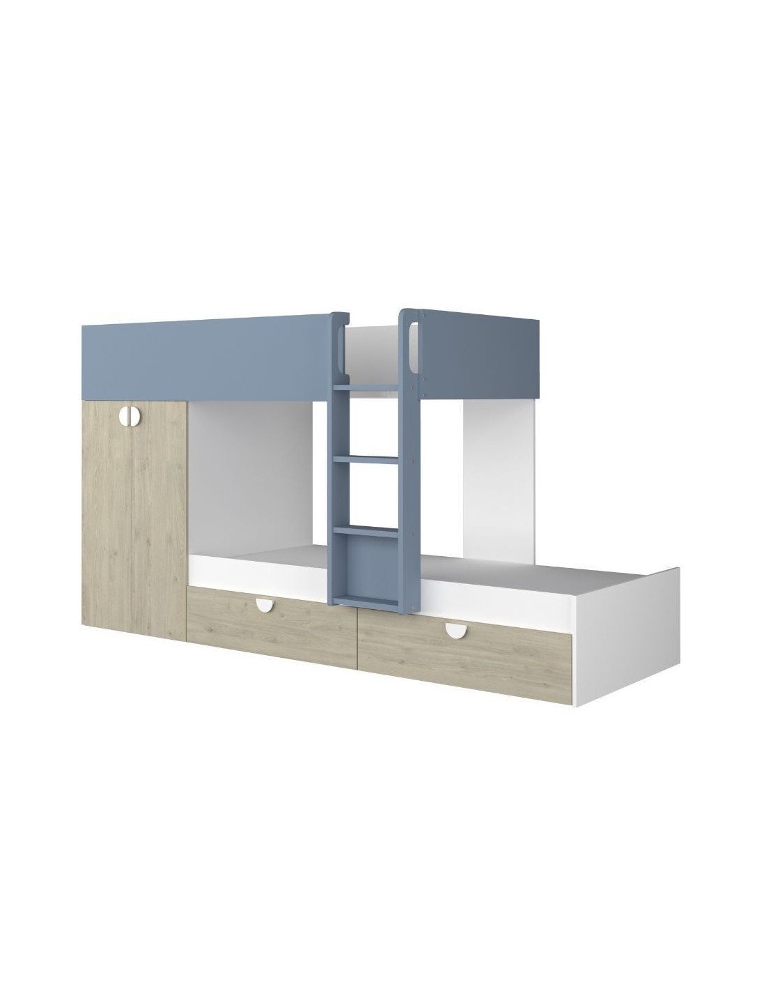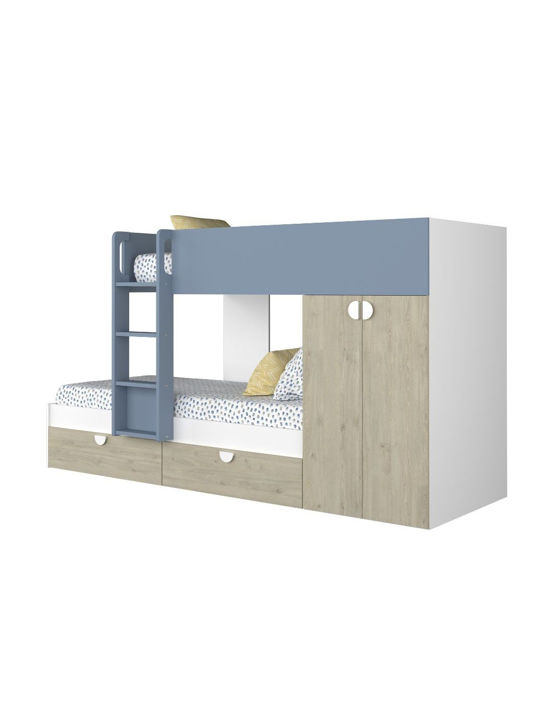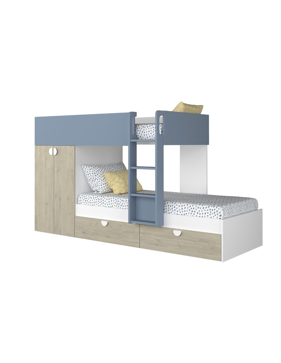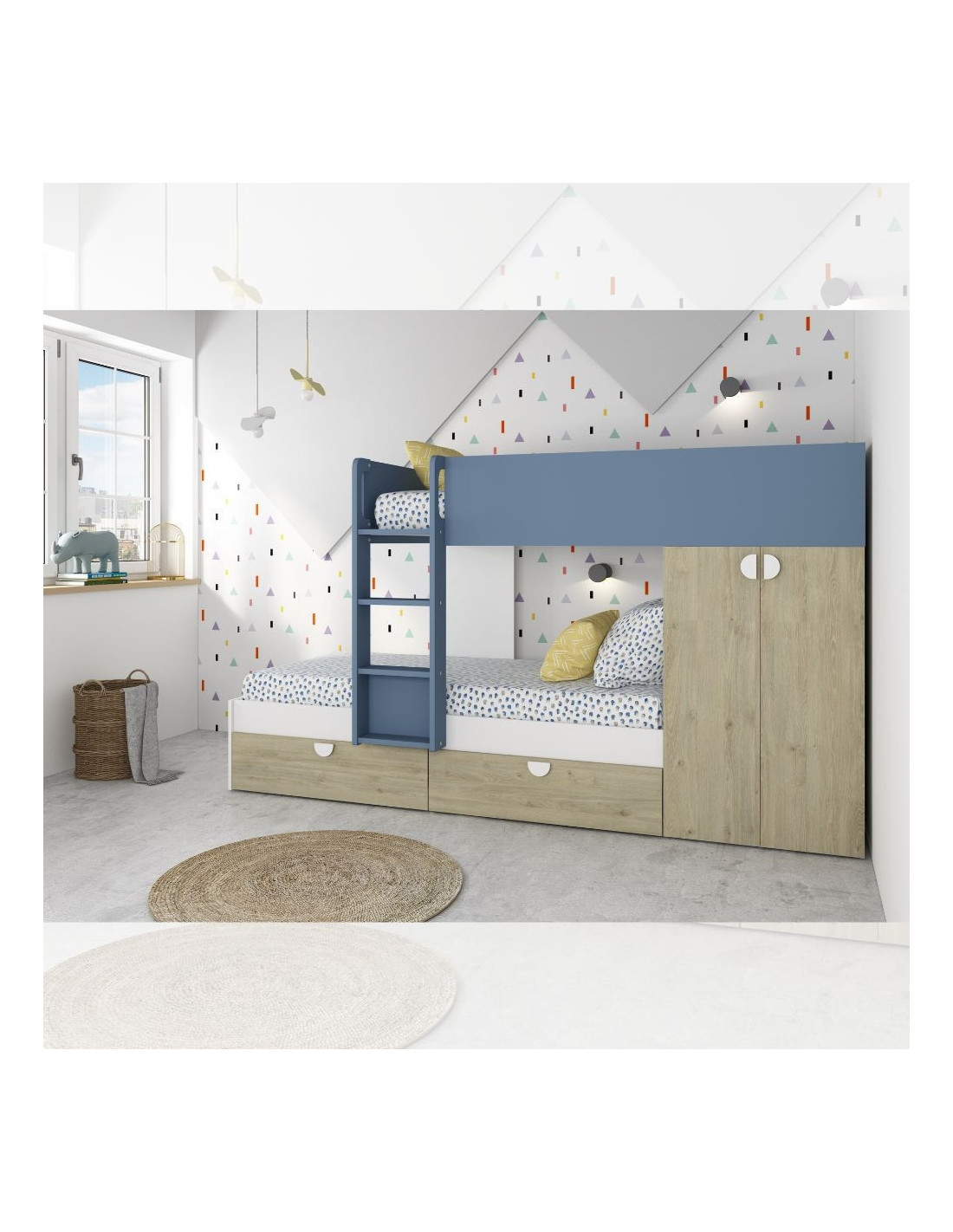 Cameretta con letto a castello con cassettoni e armadio reversibile colore rovere e azzurro