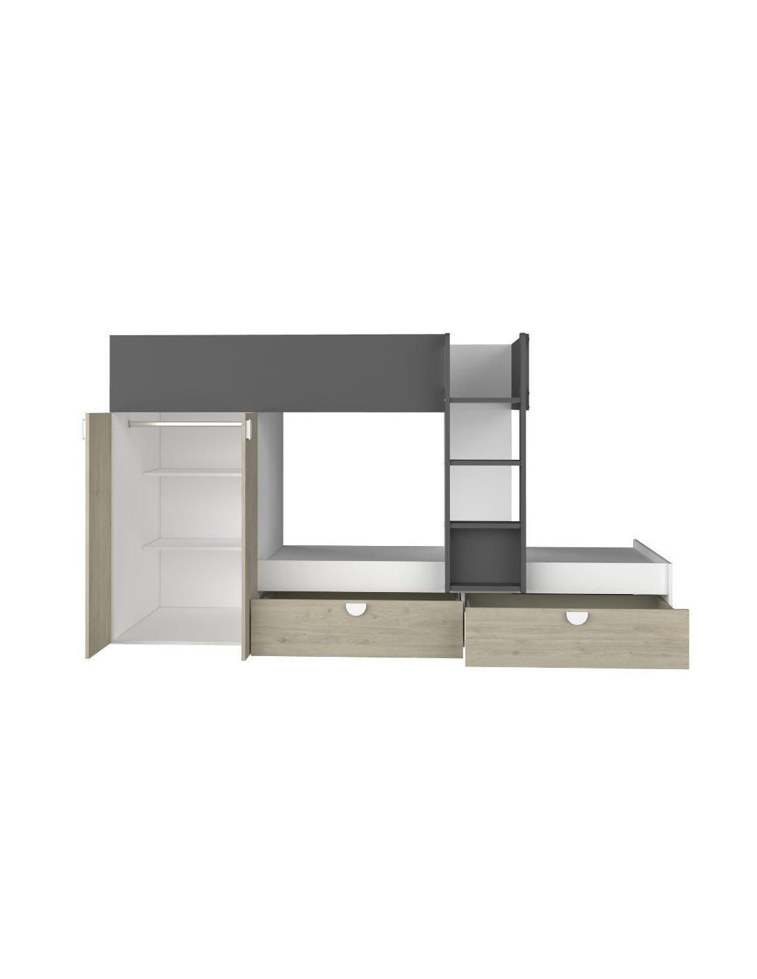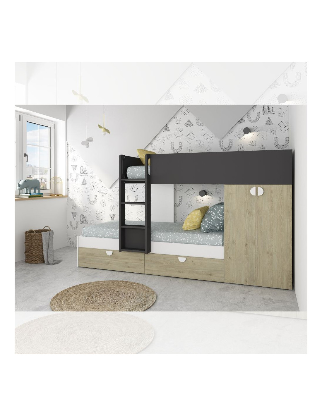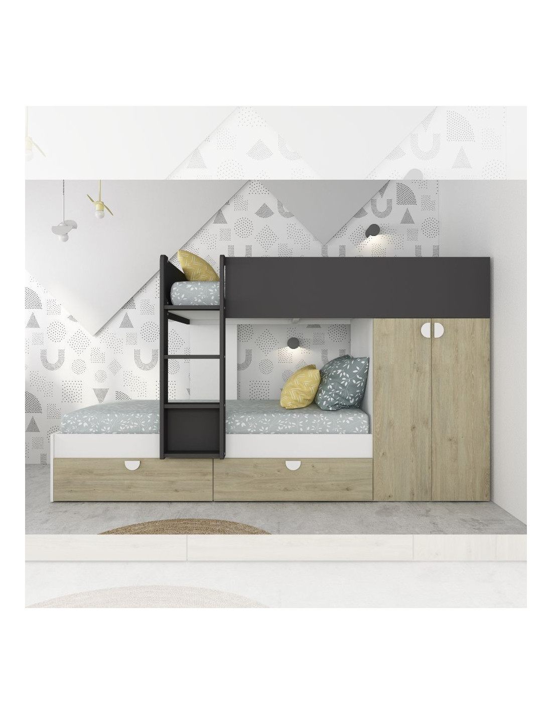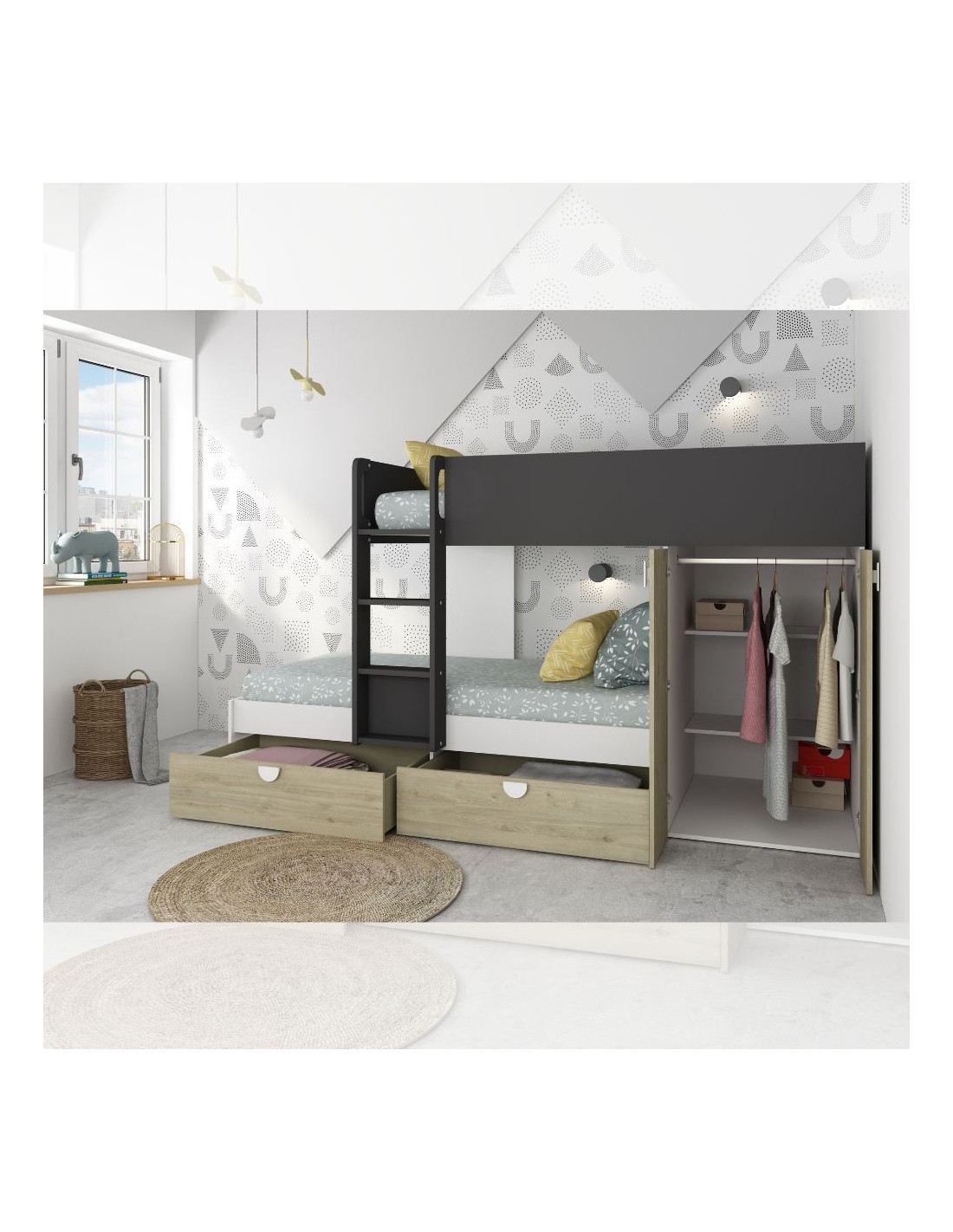 Cameretta con letto a castello con cassettoni e armadio reversibile colore rovere e antracite