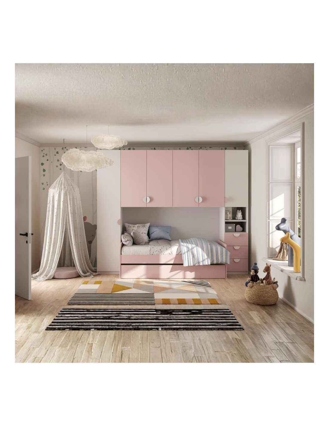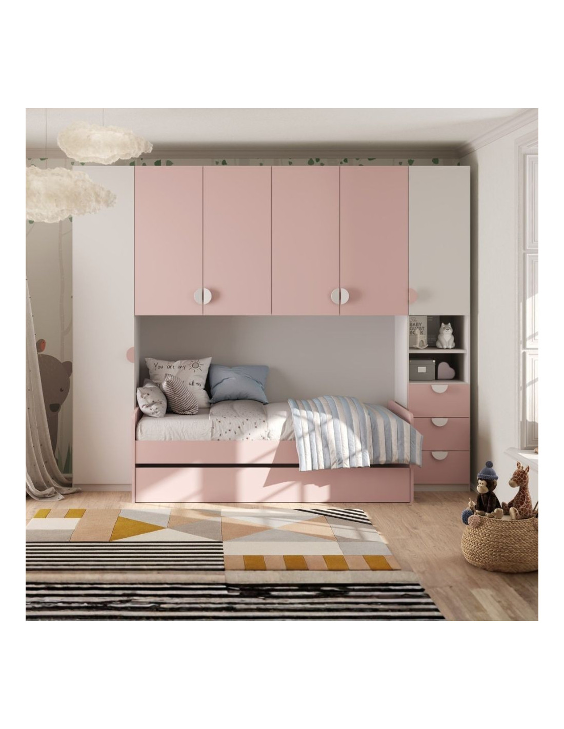 Cameretta a ponte Gilbert bianco opaco e rosa flamingo con letto estraibile