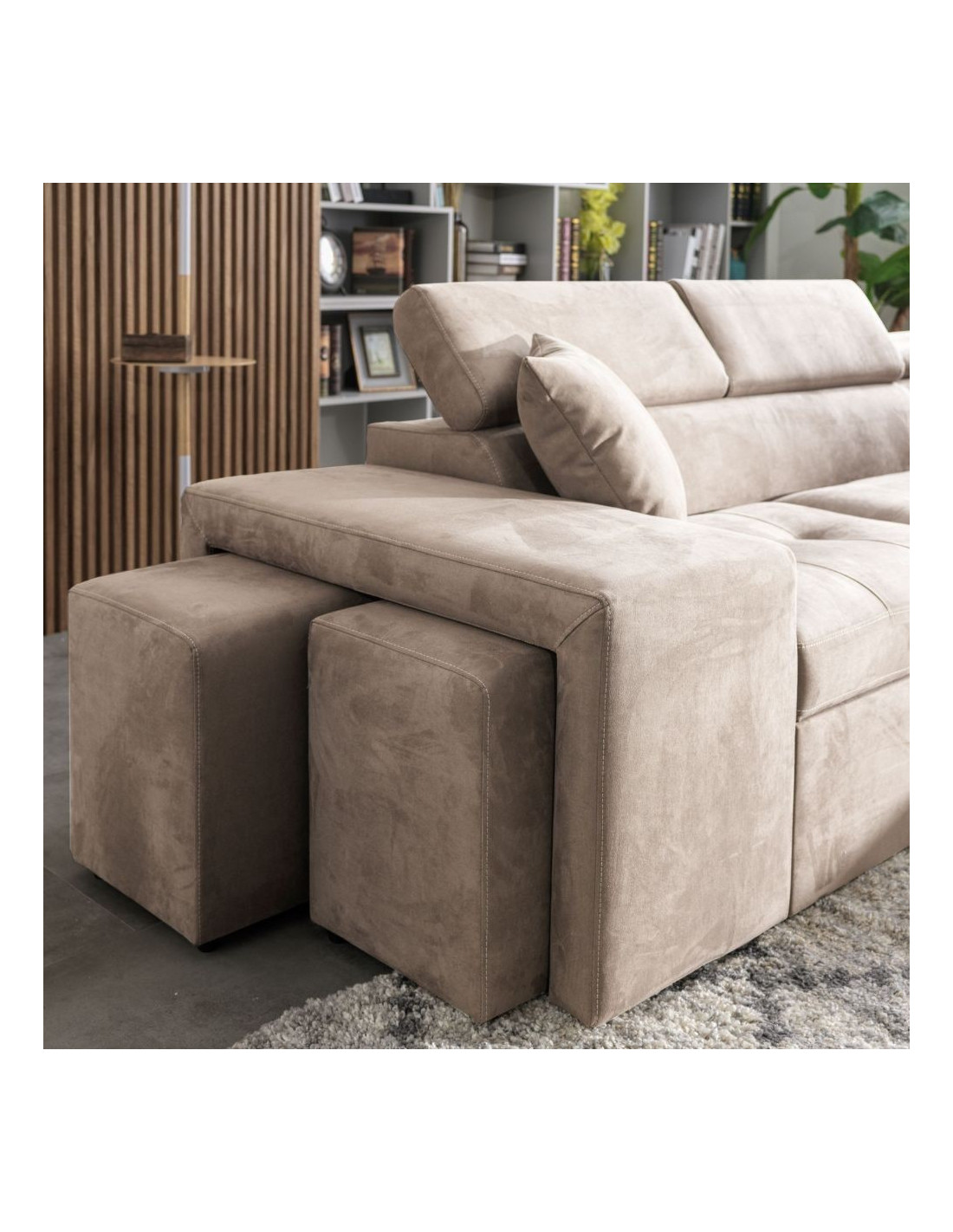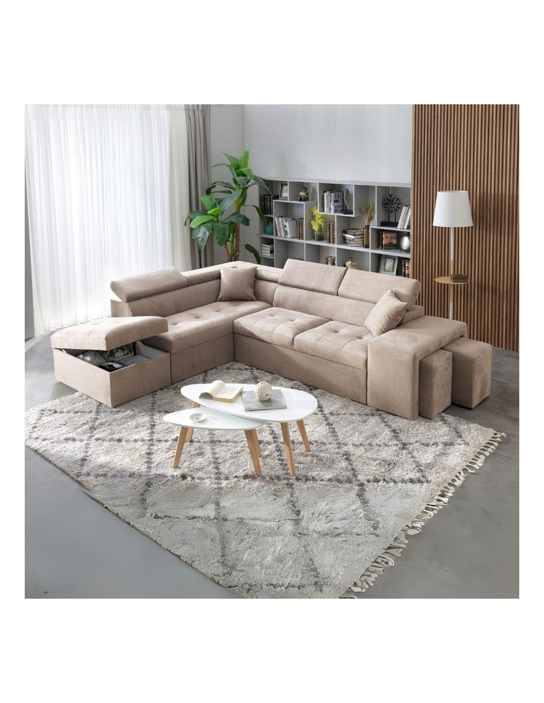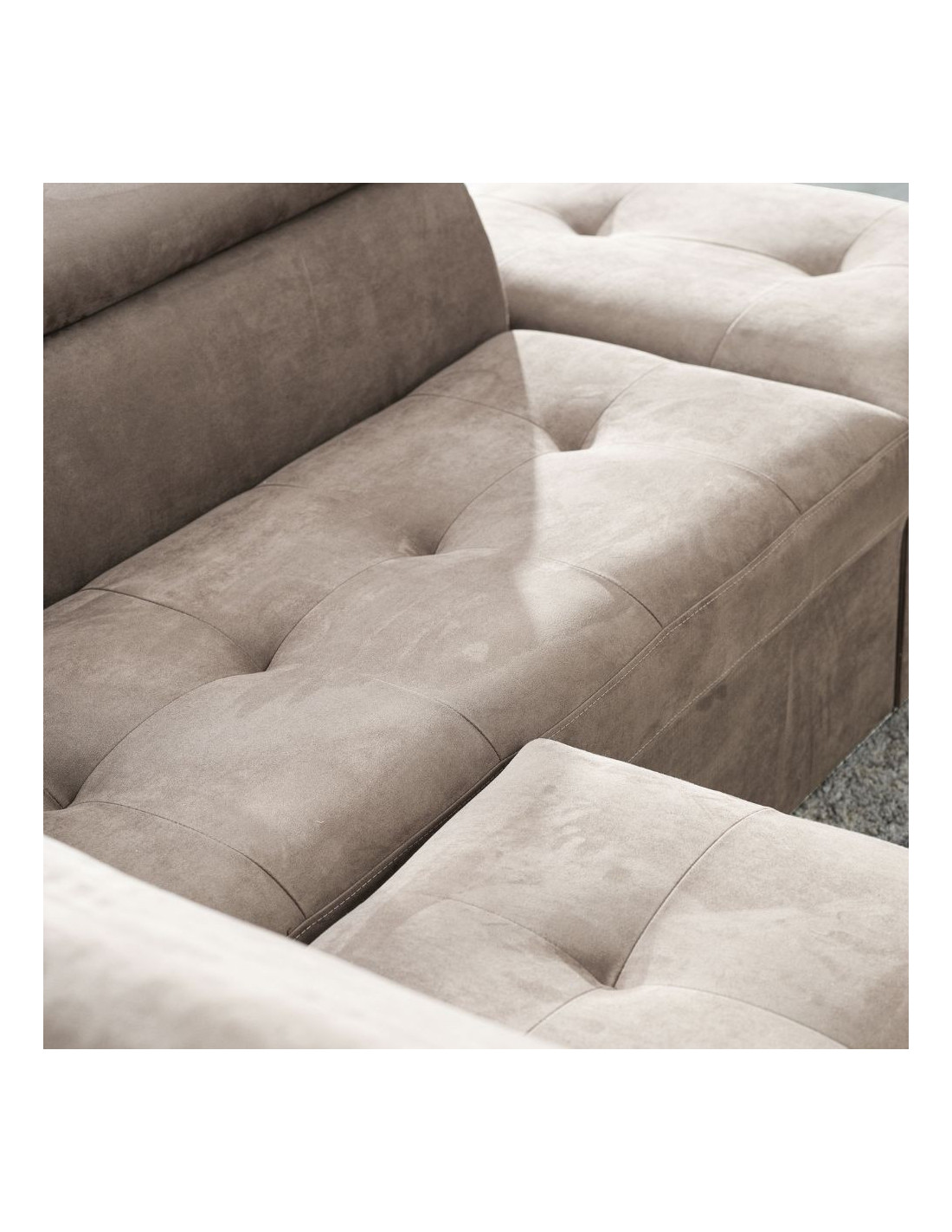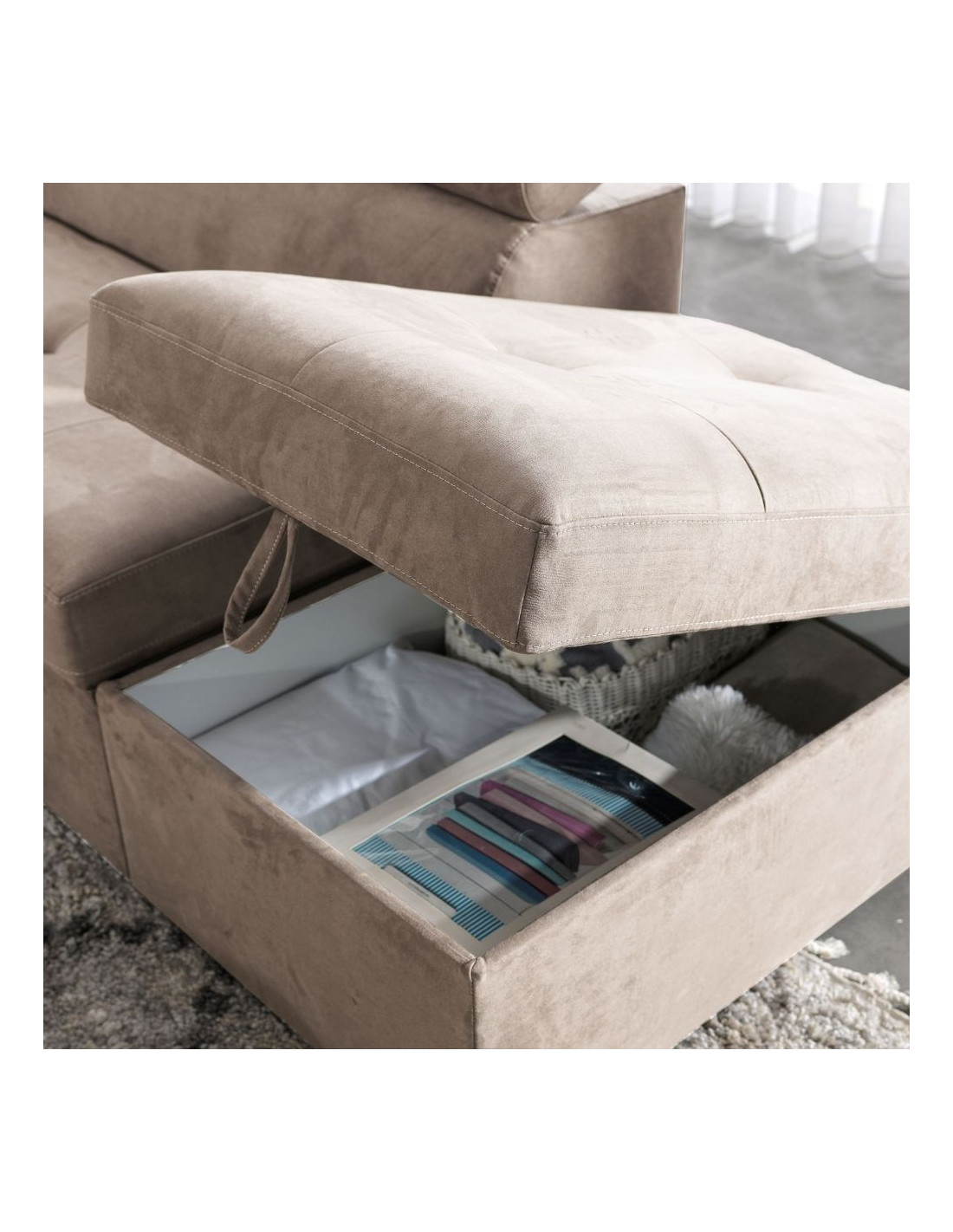 Divano angolare sinistro Belen in tessuto Portland 24 cappuccino con pouff contenitore