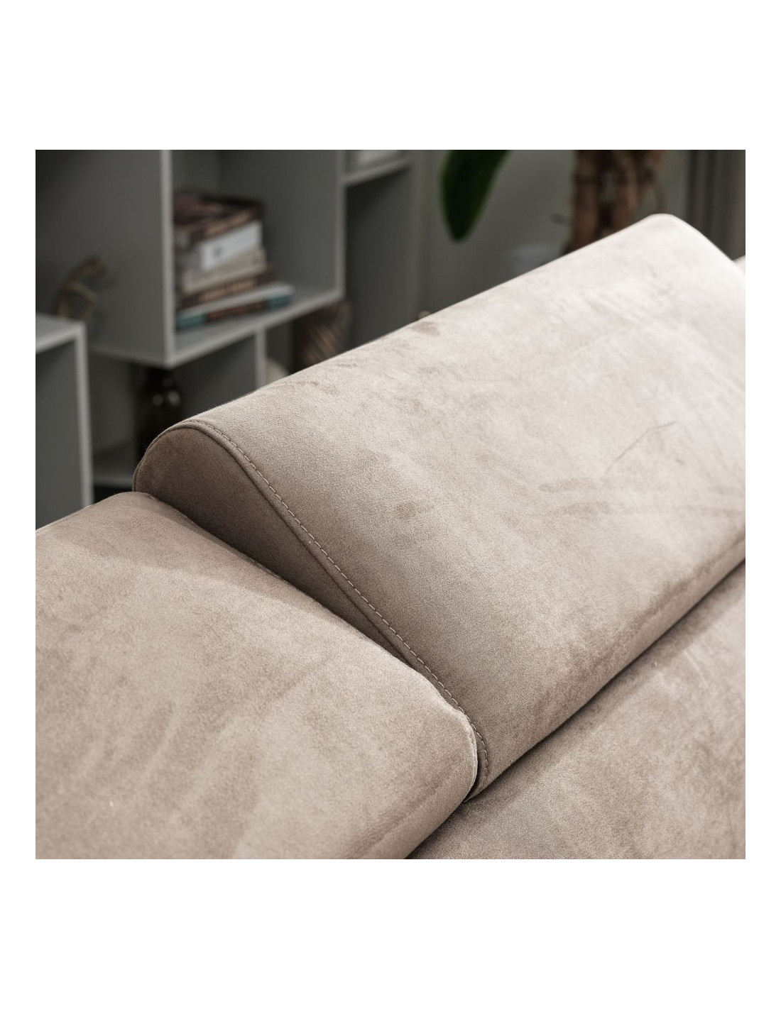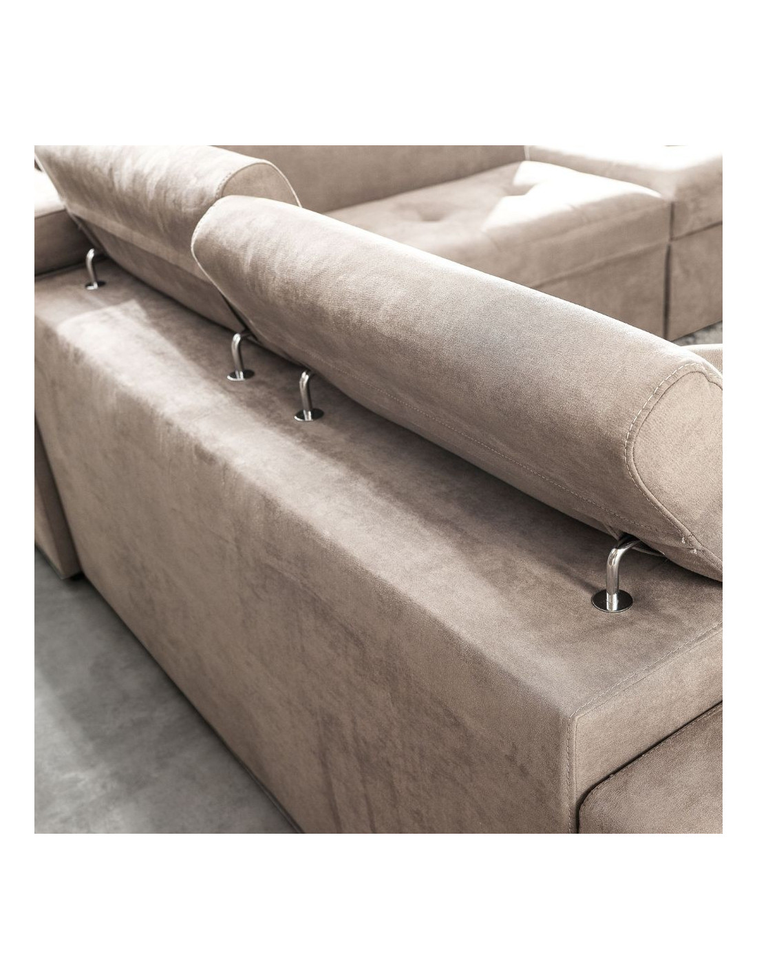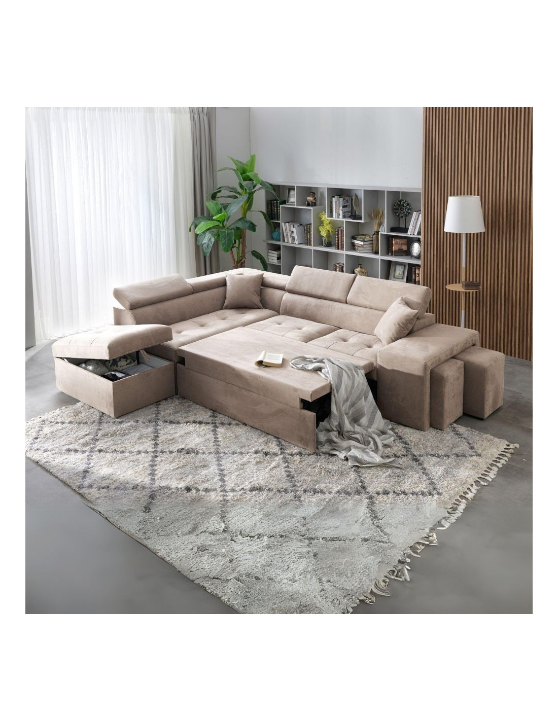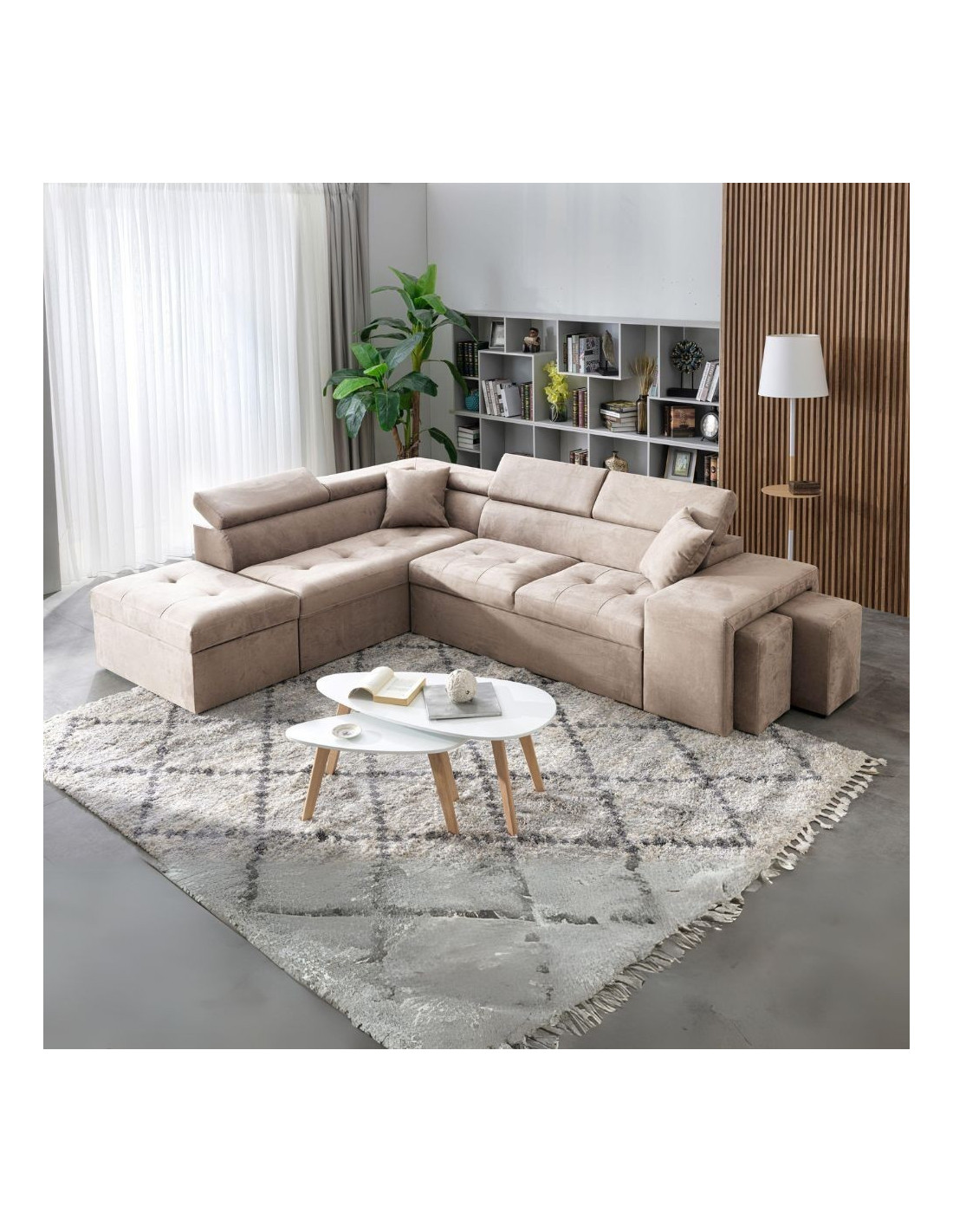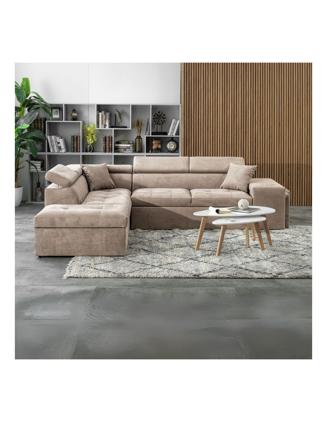 Divano angolare sinistro Belen in tessuto Portland 24 cappuccino con pouff contenitore