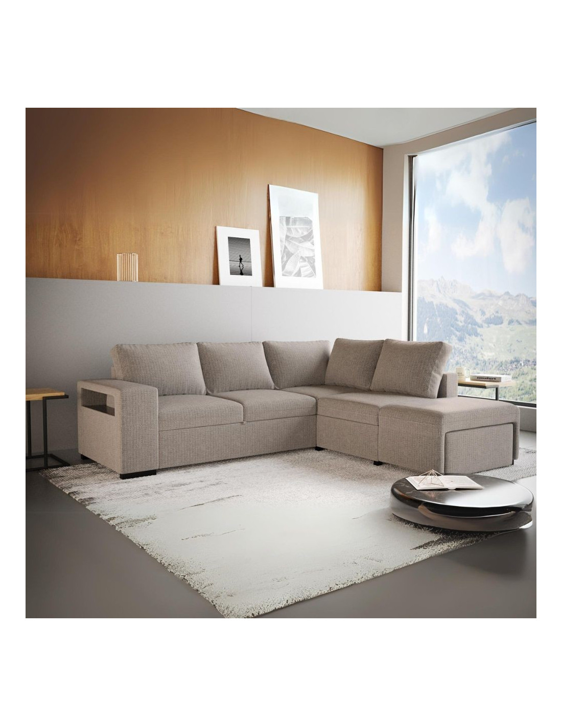 Divano letto angolare reversibile Jozzis con vano contenitore e pouf colore sabbia