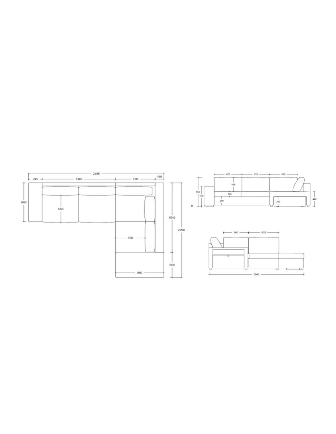 Dimensione : L 248.5 x P 209/85.5 x 90.5 H cm.