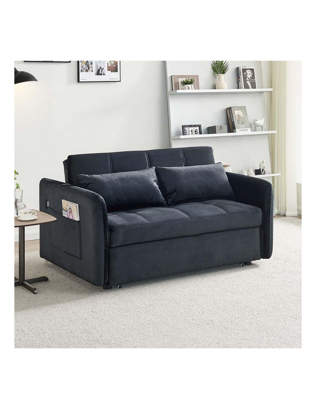 Divano letto Clorene in velluto nero con tasche e presa USB laterale