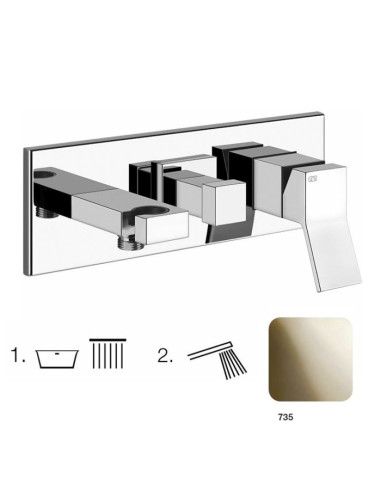 Miscelatore Doccia a parete esterno più parte incasso, 2 vie con deviatore, presa acqua e supporto doccetta, di Gessi, serie Rettangolo K, codice 53141 parte esterna, codice 44639 parte incasso, in ottone verniciato.