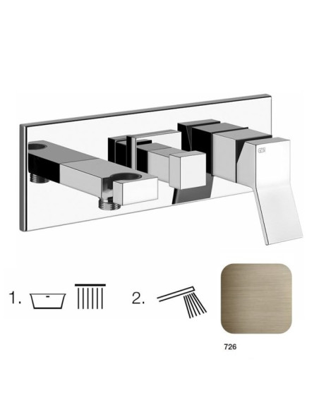 Miscelatore Doccia a parete esterno più parte incasso, 2 vie con deviatore, presa acqua e supporto doccetta, di Gessi, serie Rettangolo K, codice 53141 parte esterna, codice 44639 parte incasso, in ottone verniciato.
