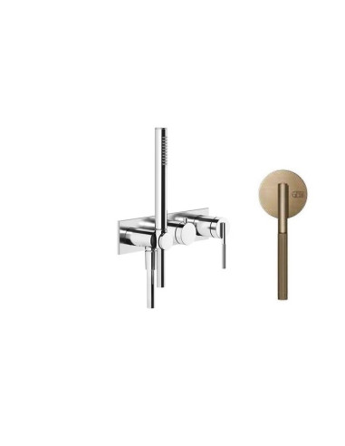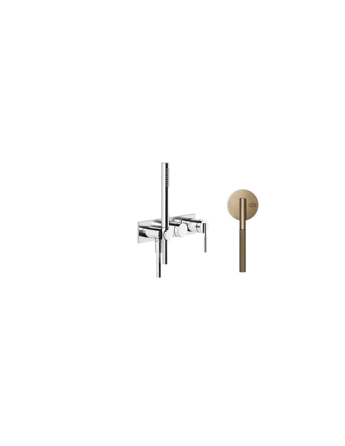 Miscelatore doccia a parete 2 vie, serie Ingranaggio, parte esterna codice 63543 2 vie, con deviatore, presa acqua e supporto doccetta, Parte incasso codice 54139 2 vie.