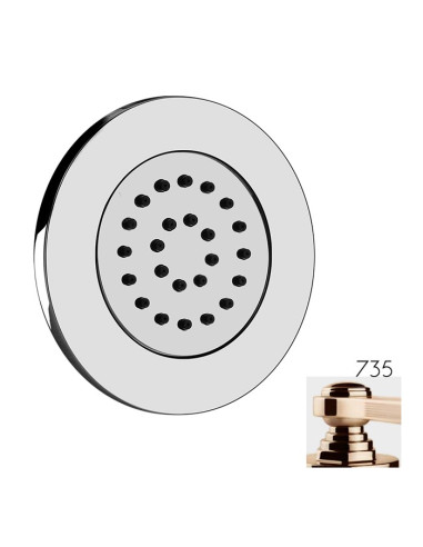 Soffione laterale orientabile, di Gessi, parte esterna codice 32982, parte incasso codice 32985.