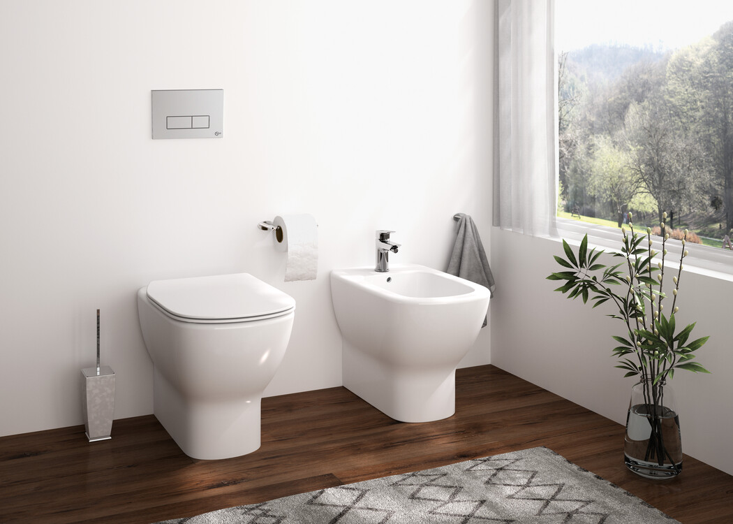 Sanitari Filo Muro Ideal Standard serie Tesi vaso Cod. T353701 AquaBlade® bidet cod. T456901 con sedile slim